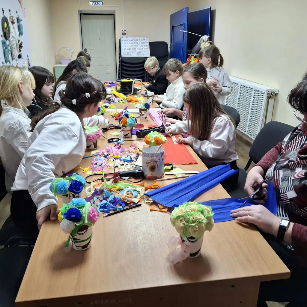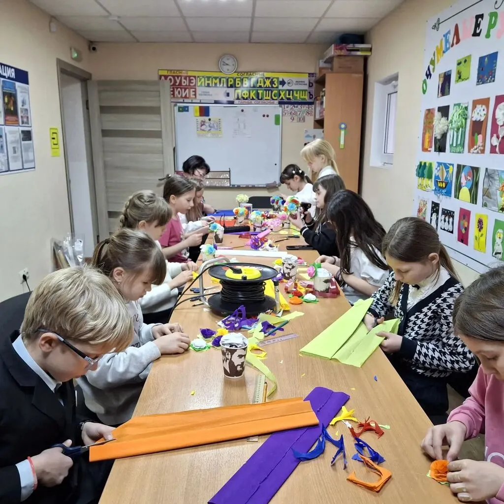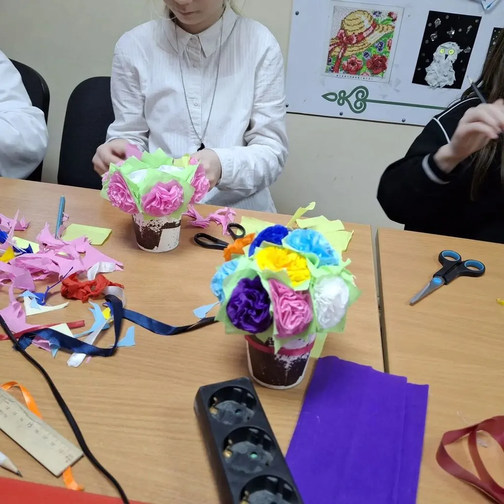 🧑🎨Под руководством наставника, ребята осваивали работу с гофрированной бумагой: учились резать, растягивать и формировать лепестки. Шаг за шагом, из простых полосок рождались яркие бутоны и пышные цветы, дополненные зелеными листочками.