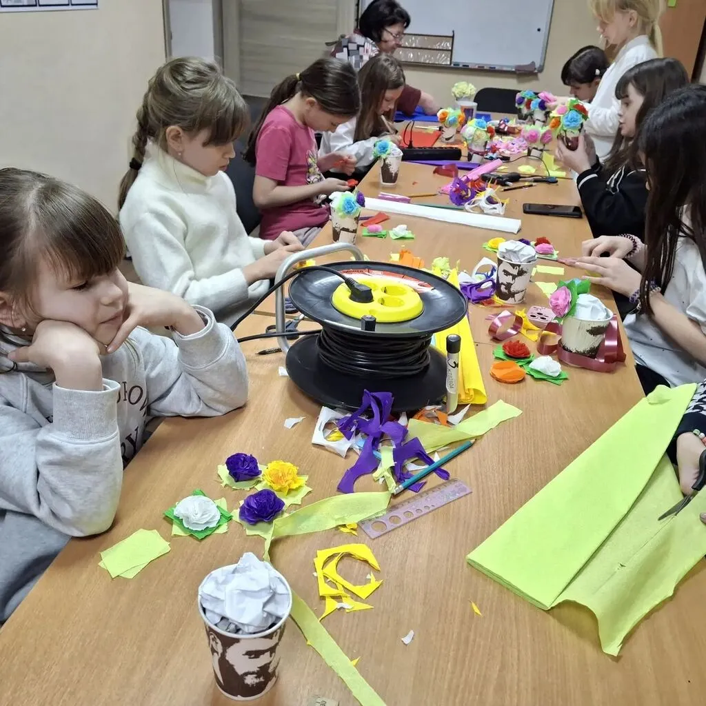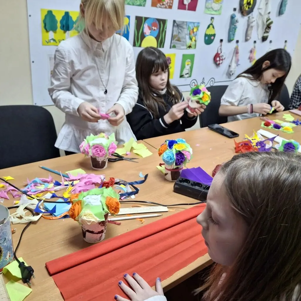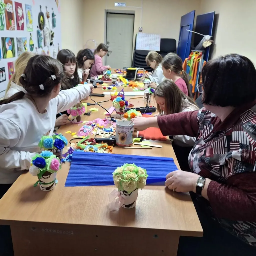 🧑🎨Под руководством наставника, ребята осваивали работу с гофрированной бумагой: учились резать, растягивать и формировать лепестки. Шаг за шагом, из простых полосок рождались яркие бутоны и пышные цветы, дополненные зелеными листочками.