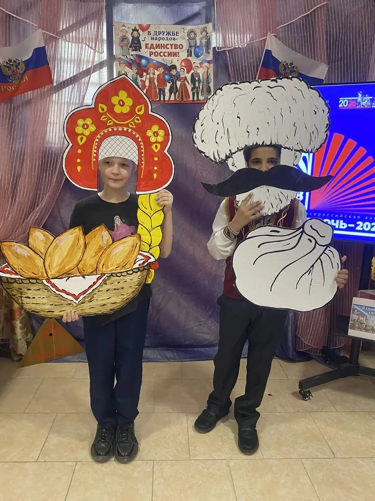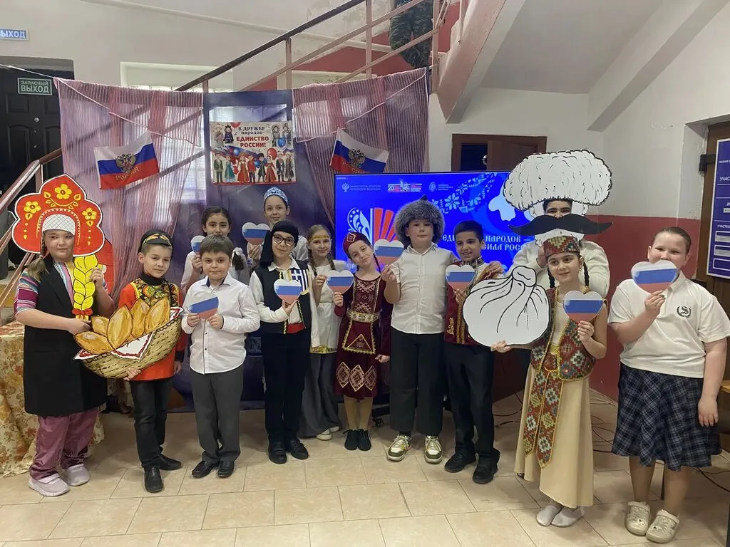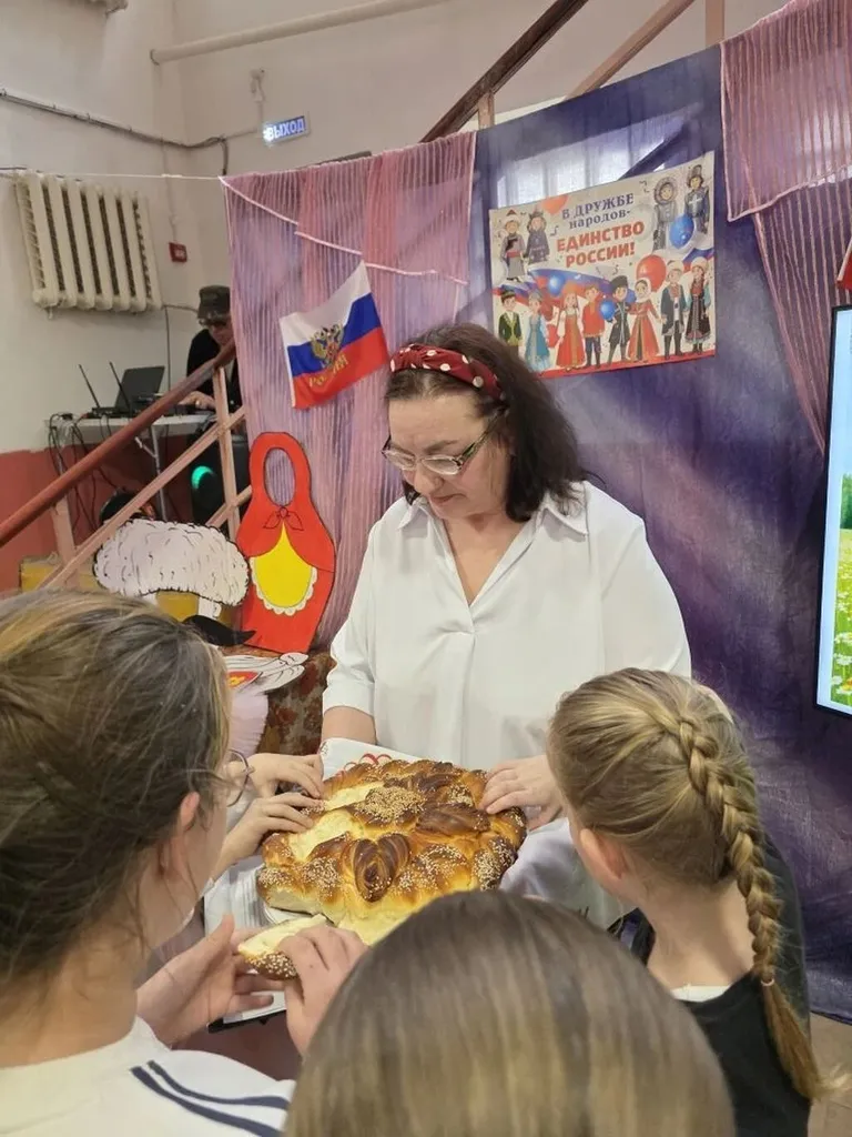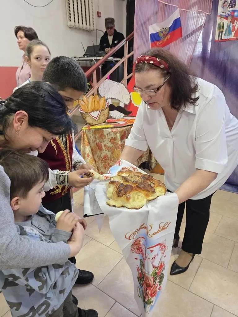 В программе было много интересного: ребята 3 "А" класса, показали интересную постановку про народы России, участники патриотического клуба " Гюрза" рассказали о героях СВО, зрители приняли участие в различных викторинах и конкурсах на тему "Народы России". Закончилось мероприятие преданием вкусного и красивого каравая который преподнесли учащиеся 3 "А" класса в знак дружбы и единения народов, проживающих на территории России.